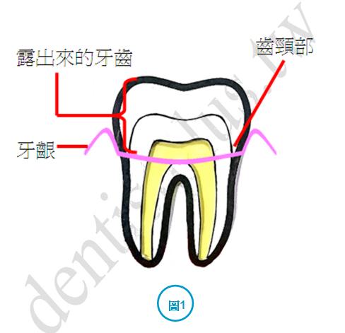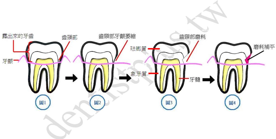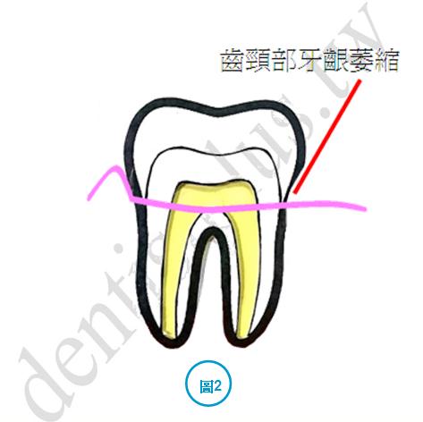 圖2是牙齦因刷牙方式不對或牙刷毛太硬或刷牙用力過度,造成牙齦萎縮,露出牙齒頸部及一部份牙根,此時常會有遇冷會酸的現象。