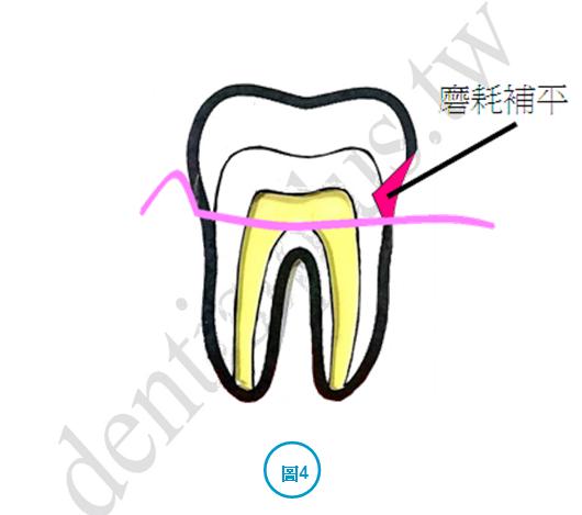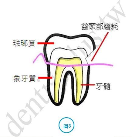 圖3是持續用力或用硬毛牙刷刷牙,造成齒頸部及露出牙根部表層磨耗凹陷,這凹陷處易卡食物且離牙髓較近,易造成蛀牙,甚至引發牙髓炎。