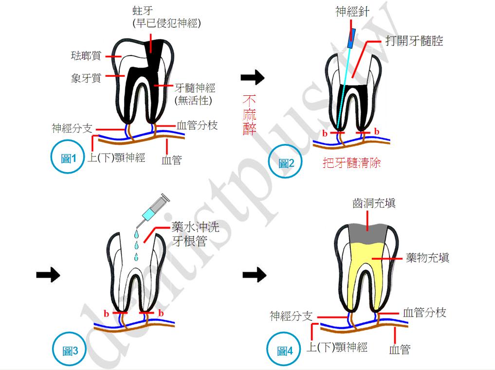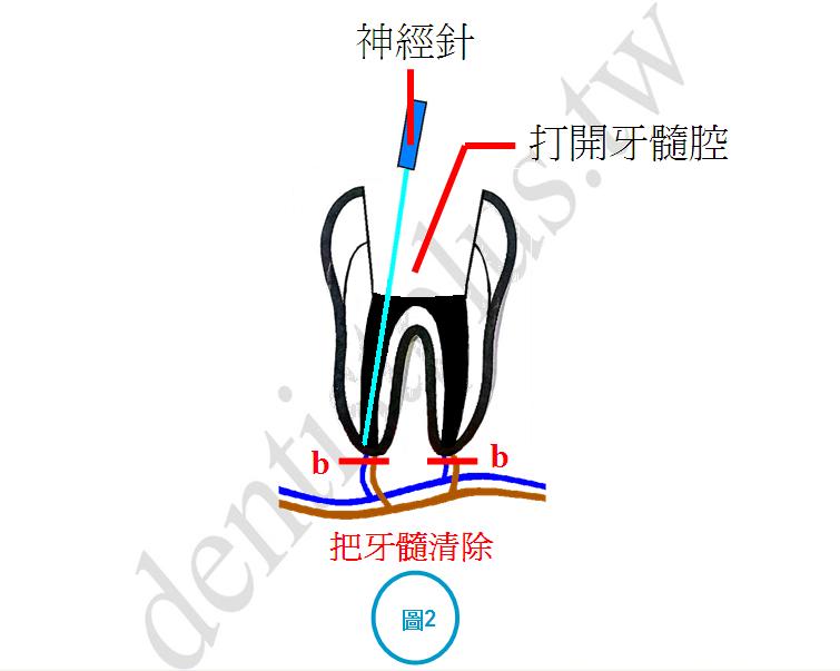 因神經已壞死,不需再打麻藥,打開髓腔,用神經針徹底清除壞死組織到b點。(圖2)