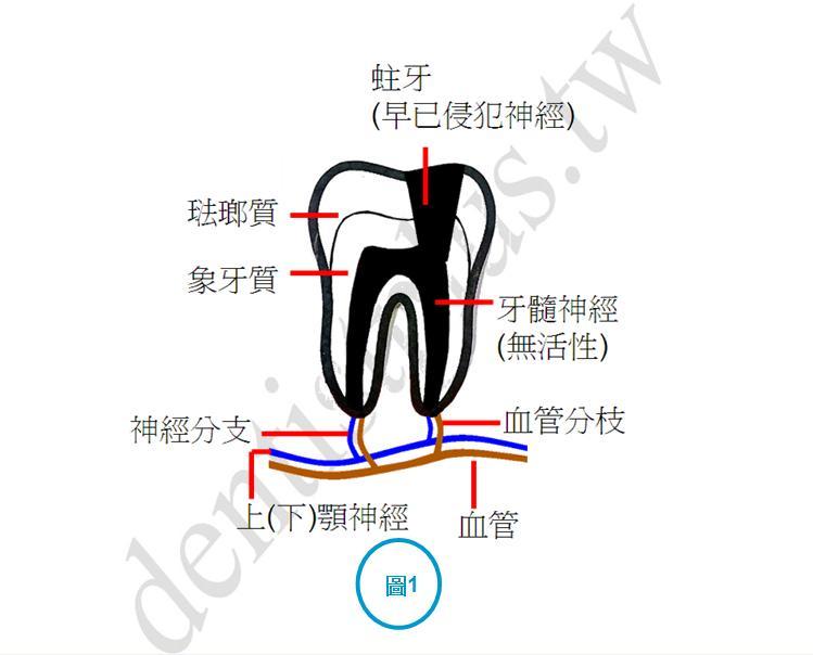 因蛀牙早已侵犯神經,長時間拖延治療,造成牙根內神經完全壞死並污染牙根管內壁,滿佈細菌。(圖1)