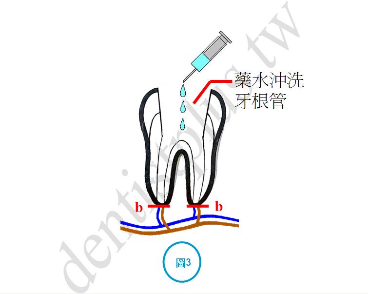 之後需2~4次回診沖洗消毒被嚴重污染的牙根管,並置入藥棉,持續消炎殺菌。(圖3需重覆2~4回)
