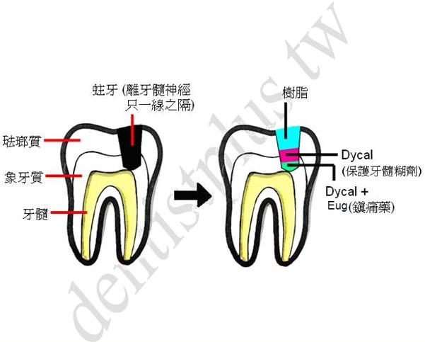 因為離牙髓只有一線之隔,非常靠近神經,所以蛀牙最底層先放加了有鎮痛藥的牙髓腔保護劑,上面再放一層牙髓腔保護劑,最後補上樹脂。